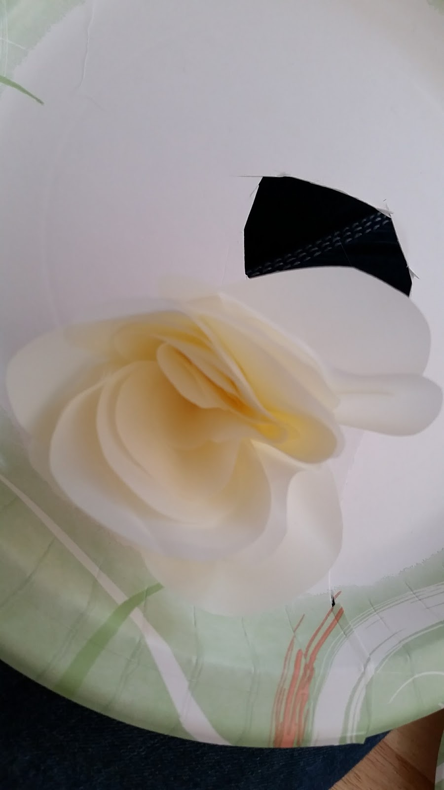 and I joined them largest on bottom to smallest on top, with a tiny dot of hot glue on top of paper plate, and then layer by layer: dot, layer, dot, layer, dot, layer, etc.
